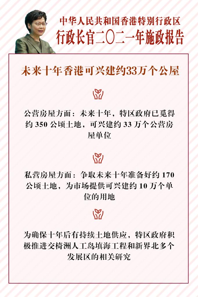 在私營(yíng)房屋方面,林鄭月娥表示,爭取未來(lái)十年準備好約170公頃土地,通過(guò)賣(mài)地或鐵路物業(yè)招標為市場(chǎng)提供可興建約100000個(gè)單位的用地。特區政府有信心維持私營(yíng)房屋土地供應的穩定。