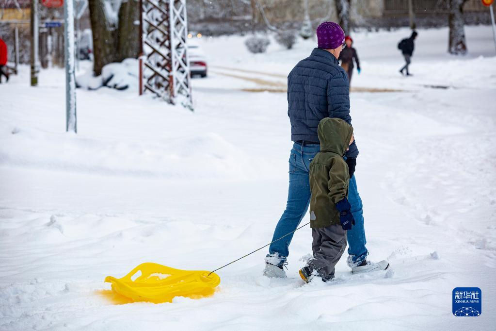 12月1日,行人在拉脫維亞里加的雪中行走。