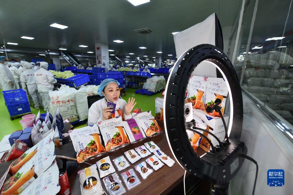 在廣西一家螺螄粉生產(chǎn)企業(yè)車(chē)間,工作人員在直播銷(xiāo)售螺螄粉(6月17日攝)。新華社記者 黃孝邦 攝