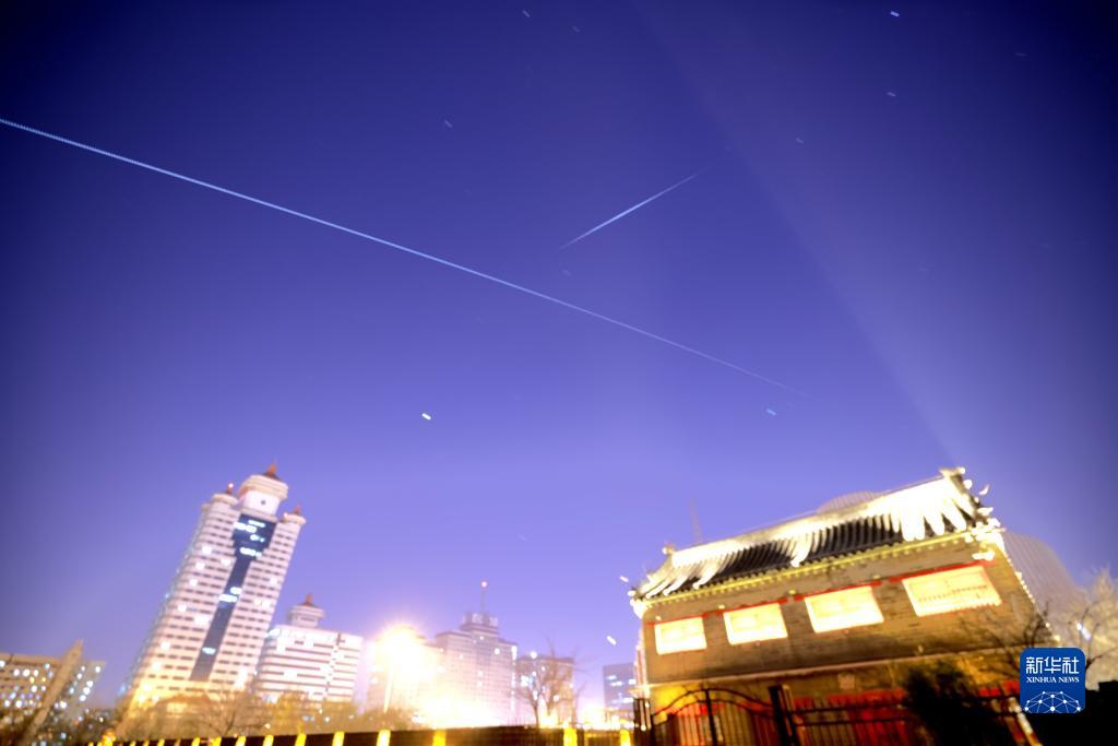 2021年12月19日,在北京西便門(mén)拍攝的中國空間站過(guò)境照片(軌跡為多張照片堆棧)。
