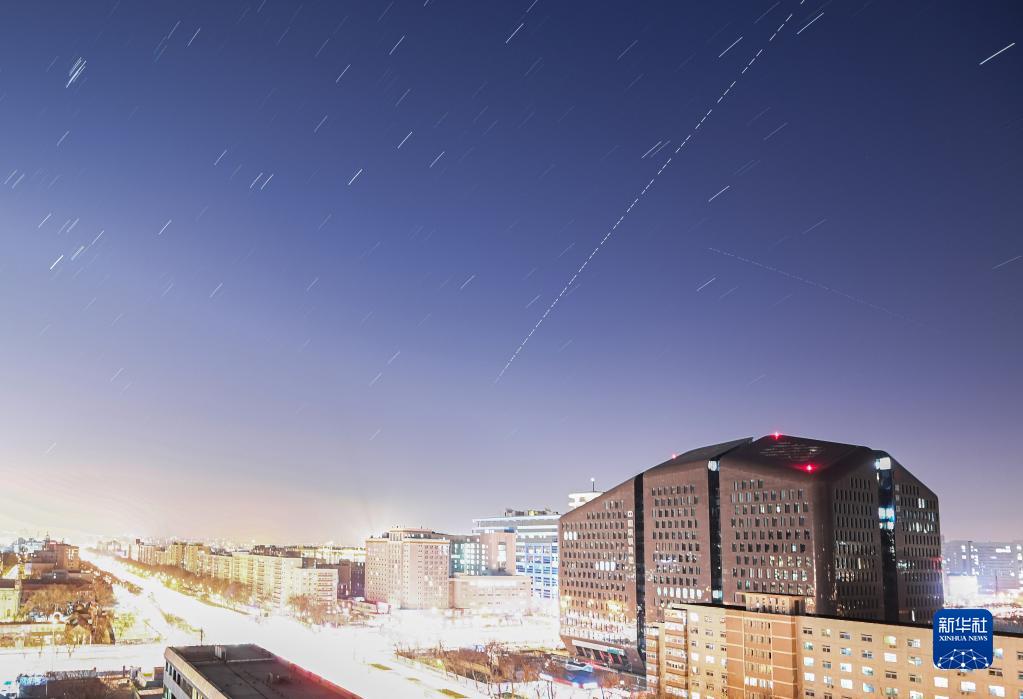 2021年12月19日在北京宣武門(mén)拍攝的中國空間站過(guò)境照片(軌跡為多張照片堆棧)。