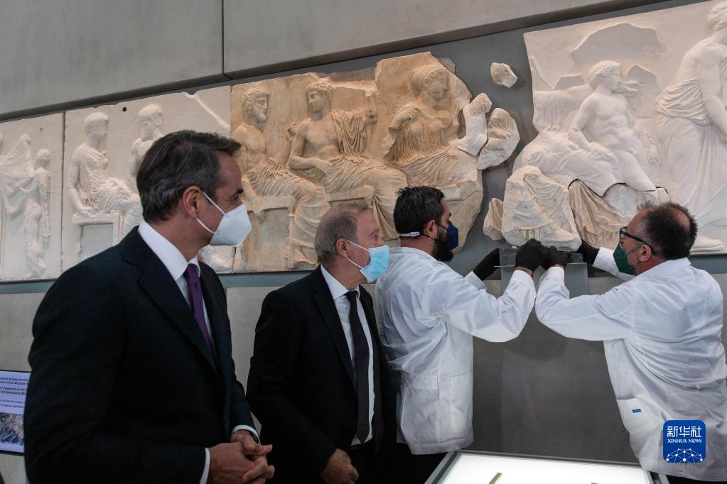 1月10日,在希臘雅典衛城博物館,工作人員正在將一塊原保存于意大利一家博物館的雅典衛城帕特農神廟石雕碎片放回原位。