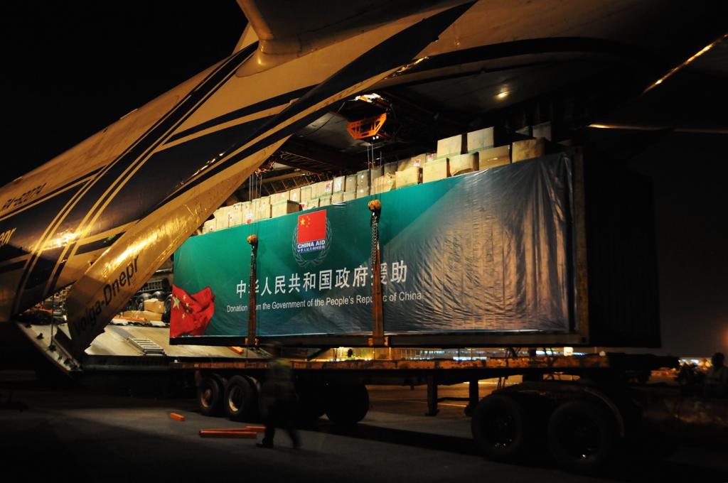 2014年10月30日,在加納首都阿克拉,工作人員卸運剛剛抵達的中國政府援助物資。(新華社記者林曉蔚攝)