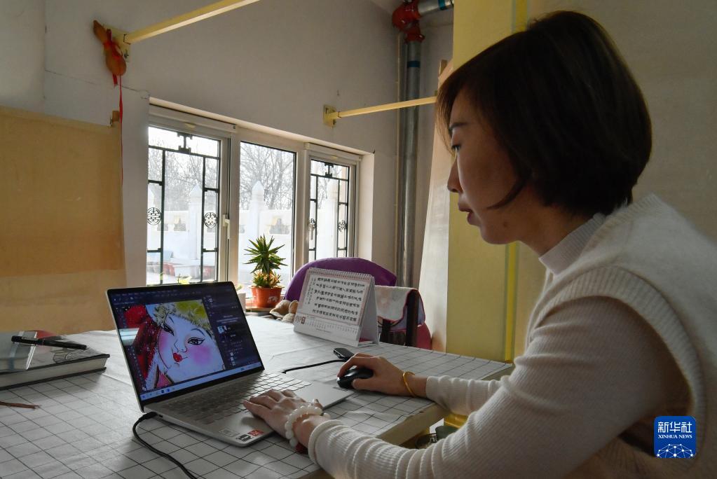 2月10日,天津楊柳青畫(huà)社青年傳承人王艷在彩繪工作室利用軟件修改年畫(huà)細節。