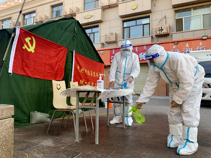 中共阿拉善盟委統戰部?jì)擅h員在額濟納旗一小區執勤點(diǎn)消毒(2021年10月28日攝)。新華社記者 王靖 攝