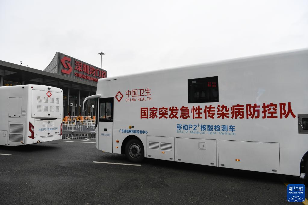 2月17日,移動(dòng)核酸檢測車(chē)、物資運輸保障車(chē)經(jīng)深圳灣口岸赴港支援。新華社記者 梁旭 攝