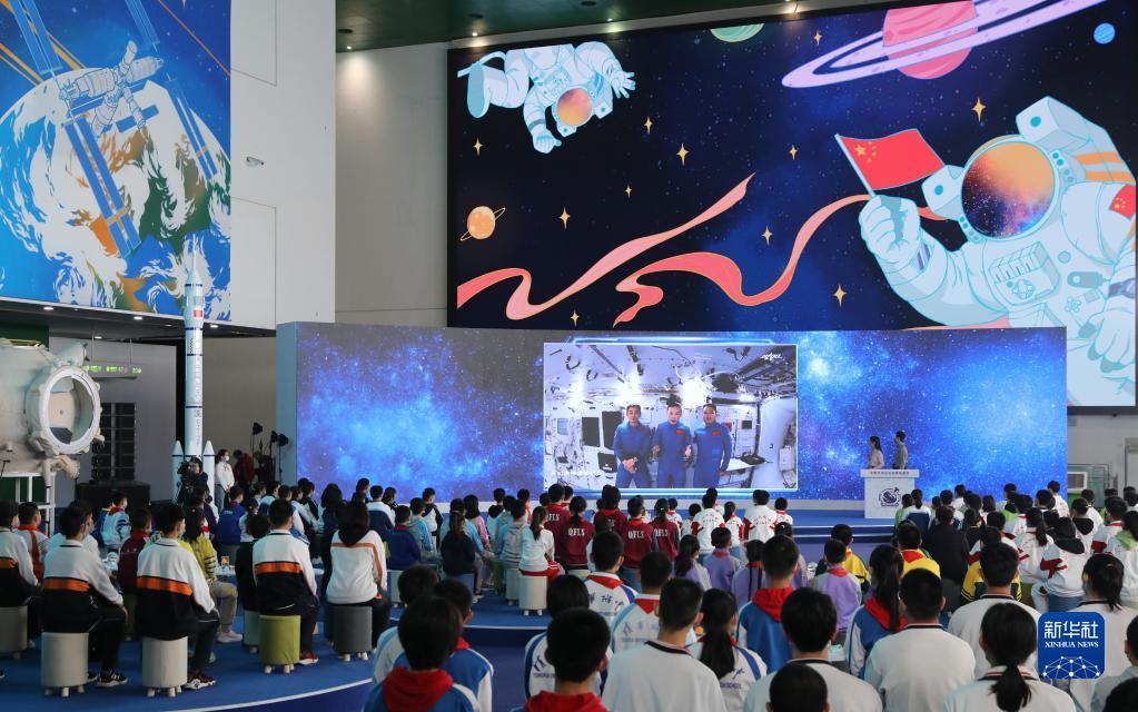2021年12月9日,“天宮課堂”第一課開(kāi)課,神舟十三號乘組航天員翟志剛、王亞平、葉光富在空間站進(jìn)行太空授課。這是學(xué)生們在北京中國科技館聽(tīng)課。新華社記者 金立旺 攝