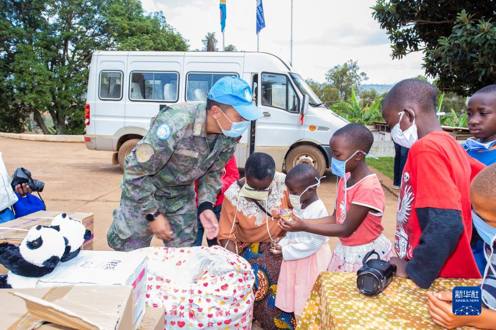 2021年6月1日,在剛果(金)東部城市布卡武的SOS兒童村,中國第24批赴剛果(金)維和醫療分隊的隊員把糖果分給孩子們。新華社發(fā)