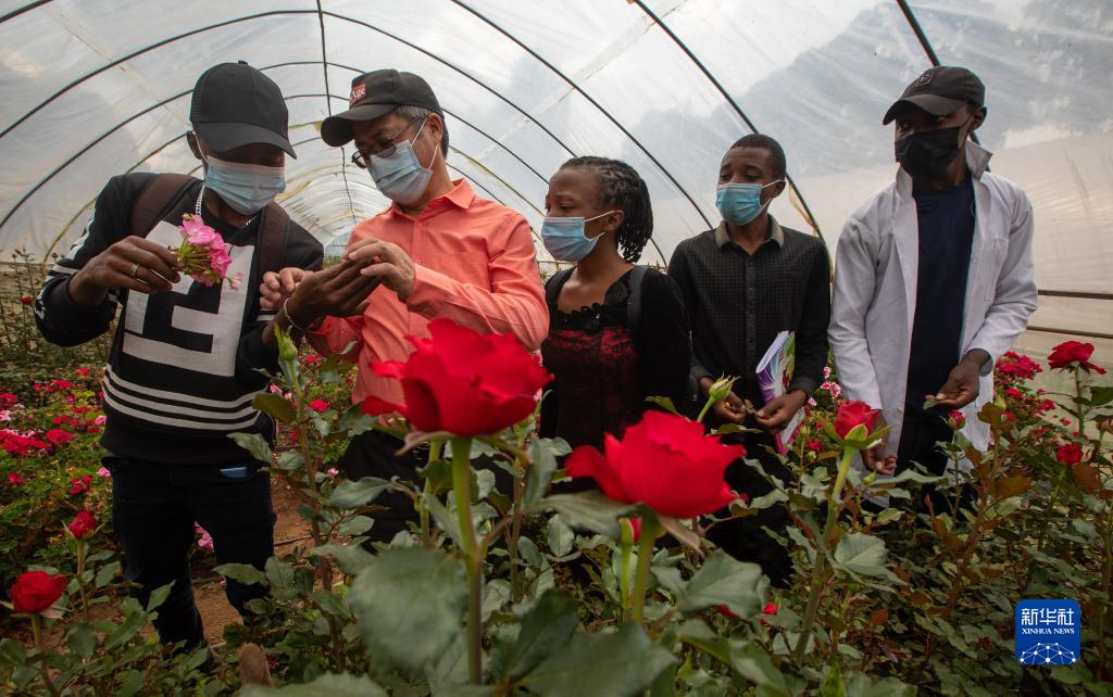 2021年6月25日,在肯尼亞納庫魯郡的埃格頓大學(xué),來(lái)自中國的農學(xué)教授劉高瓊(左二)和學(xué)生們在溫室大棚內討論花卉育種和病蟲(chóng)害防治。新華社記者 張宇 攝