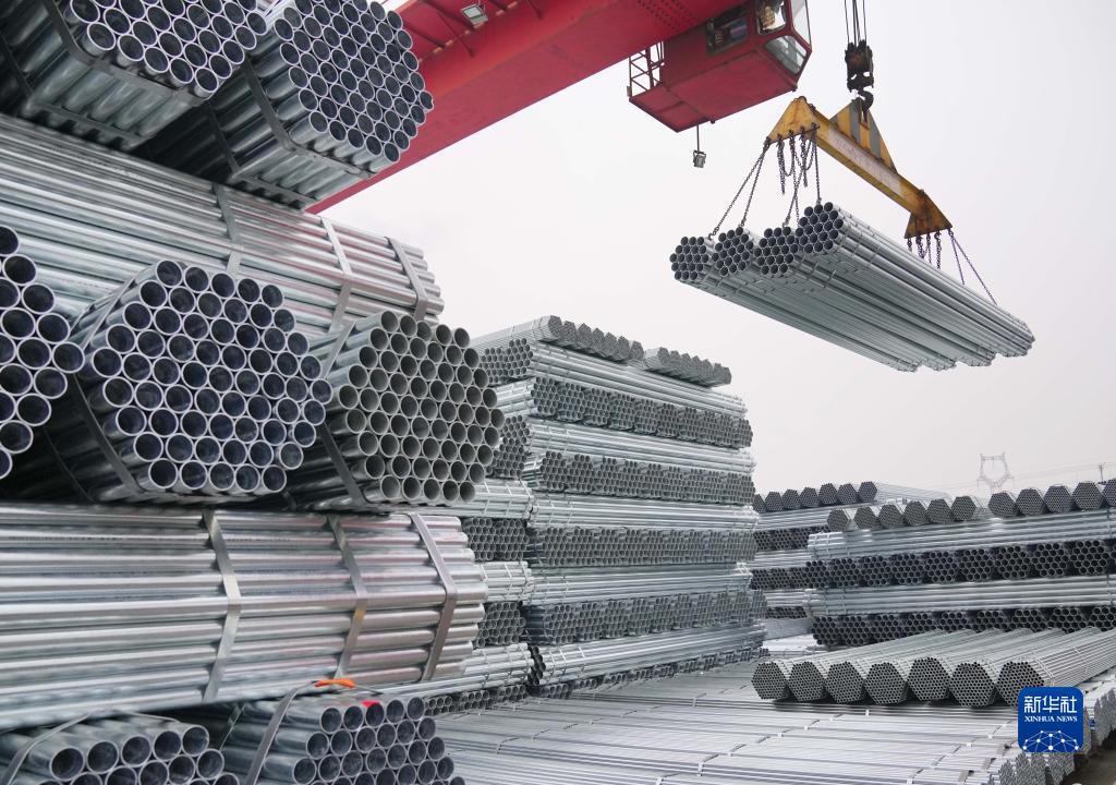 河北省遷安市一家鍍鋅管生產(chǎn)企業(yè)的工人操作機械設備吊運鋼管(2021年12月11日攝)。新華社記者 楊世堯 攝