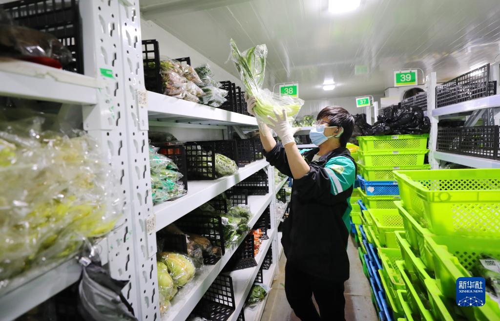 3月15日深夜,在位于上海閔行區老滬閔路的一家網(wǎng)絡(luò )購物平臺倉配站點(diǎn),工作人員在冷藏庫內將新到貨的蔬菜分類(lèi)擺放到貨架上。新華社記者 方喆 攝