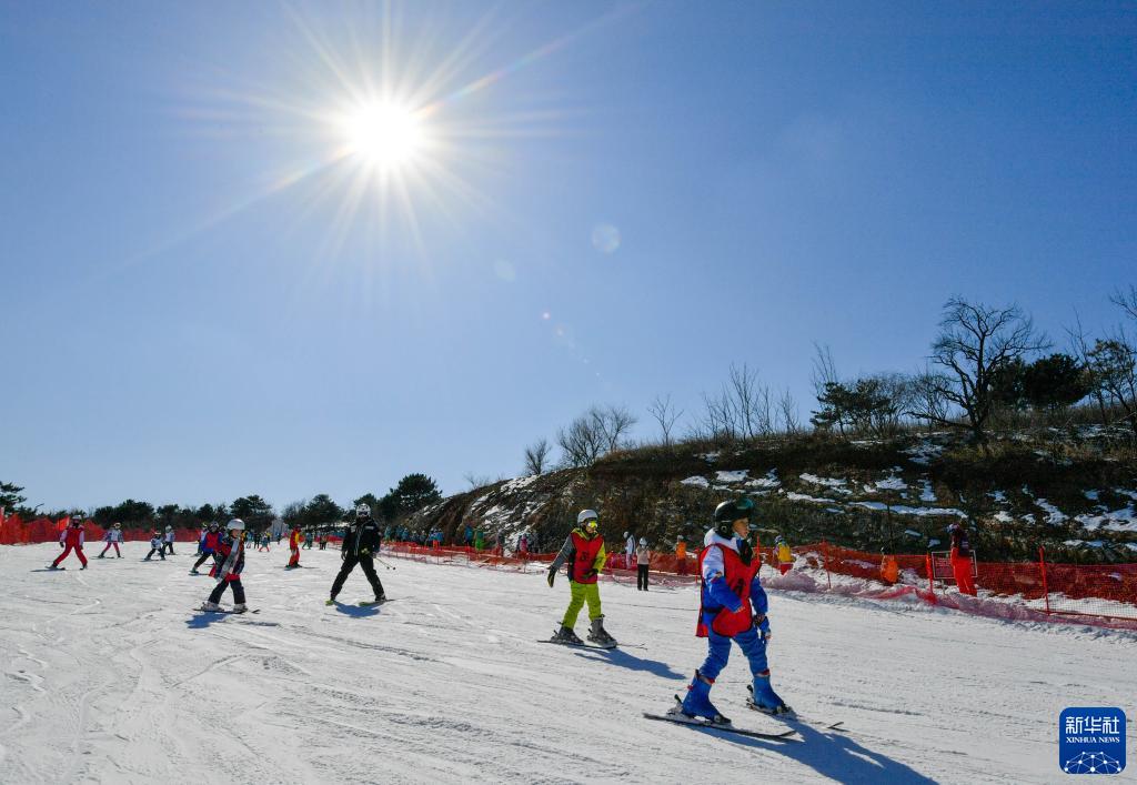 在天津薊洲國際滑雪場(chǎng),教練與小朋友在雪道上練習滑雪(2月20日攝)。新華社記者 孫凡越 攝