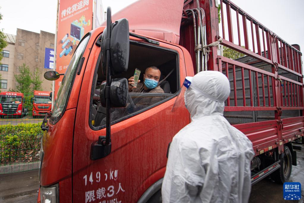 4月13日,工作人員查驗駛入杭州傳化公路港的貨車(chē)司機健康碼。新華社記者 江漢 攝