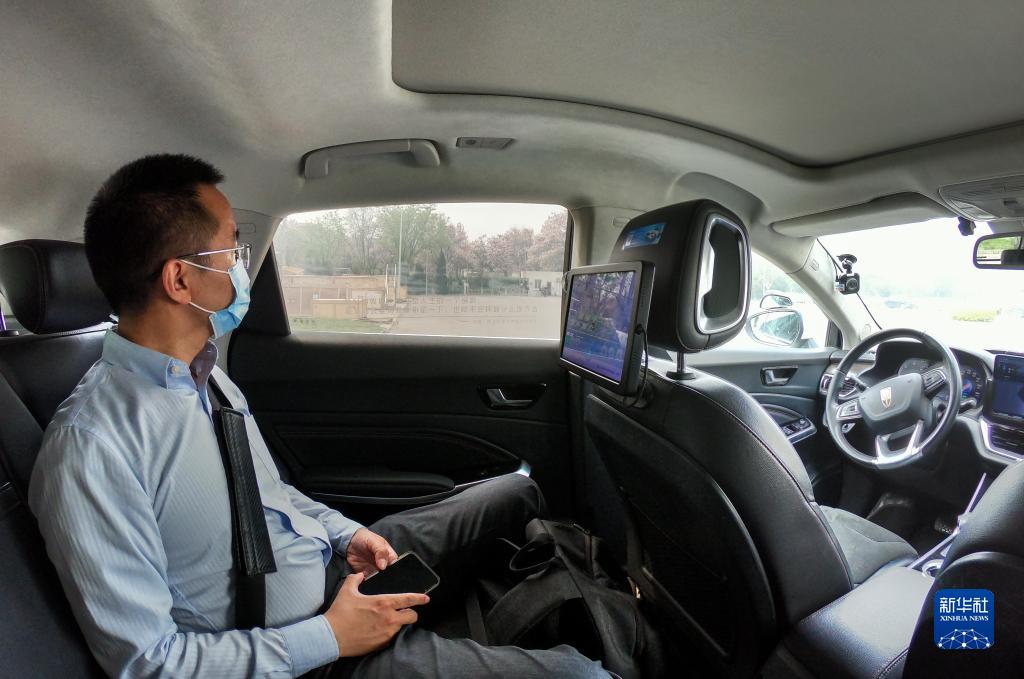 在北京經(jīng)濟技術(shù)開(kāi)發(fā)區,一名乘客在體驗“主駕無(wú)人、副駕駛配備安全員”的無(wú)人駕駛車(chē)(2022年4月25日攝)。新華社記者 彭子洋 攝
