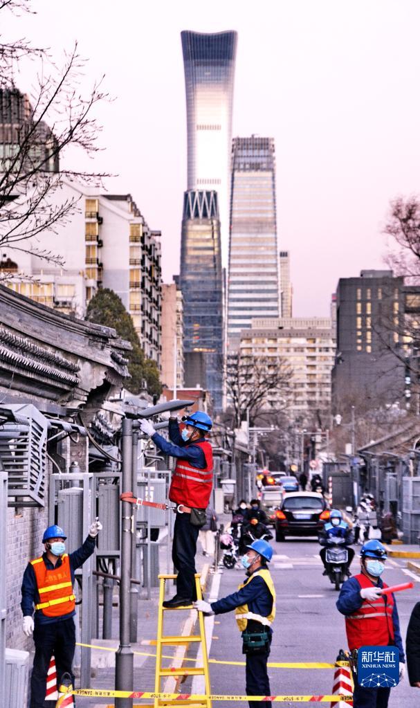 北京市城市照明管理中心的技術(shù)人員在檢測小街巷中的路燈(2021年12月31日攝)。新華社記者 李欣 攝