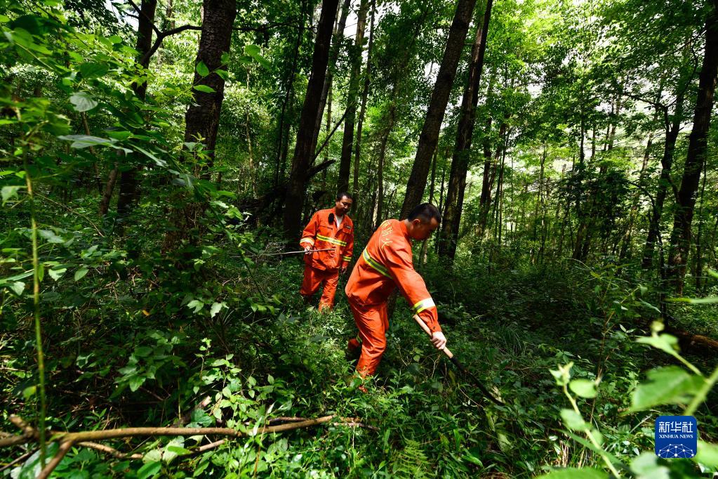 7月13日,在貴陽(yáng)市長(cháng)坡嶺國家級森林公園,村級林長(cháng)郭?。ê螅┡c護林員在公園林區巡護。 新華社記者 楊文斌 攝