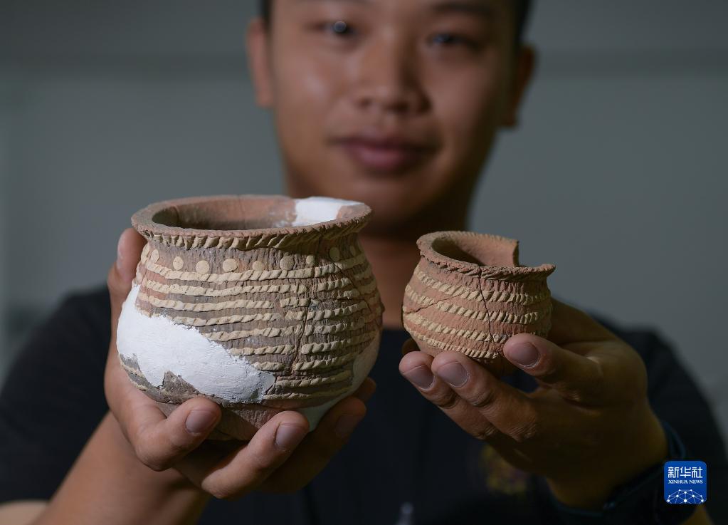 考古工作人員展示甘肅慶陽(yáng)市南佐新石器時(shí)代遺址內出土的箍白泥附加堆紋夾砂陶罐(2022年8月25日攝)。新華社記者 李賀 攝
