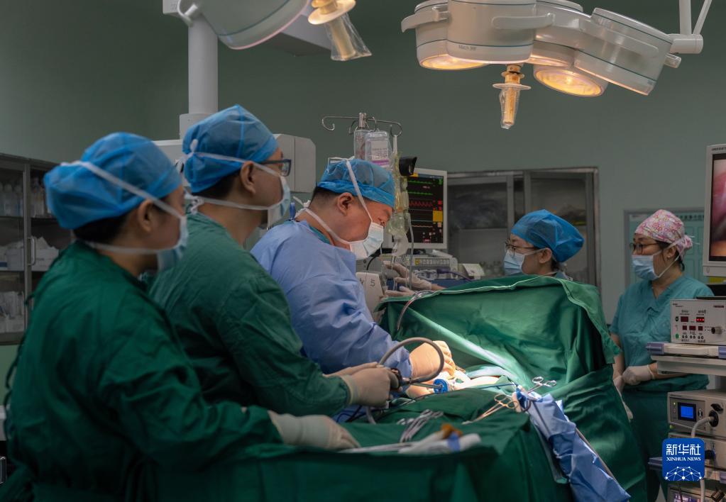 在北京市第六醫院的醫聯(lián)體胸外科病房手術(shù)室,北京協(xié)和醫院與北京市第六醫院的醫護人員進(jìn)行團隊協(xié)作開(kāi)展胸腔鏡手術(shù)(2021年6月3日攝)。新華社記者 才揚 攝