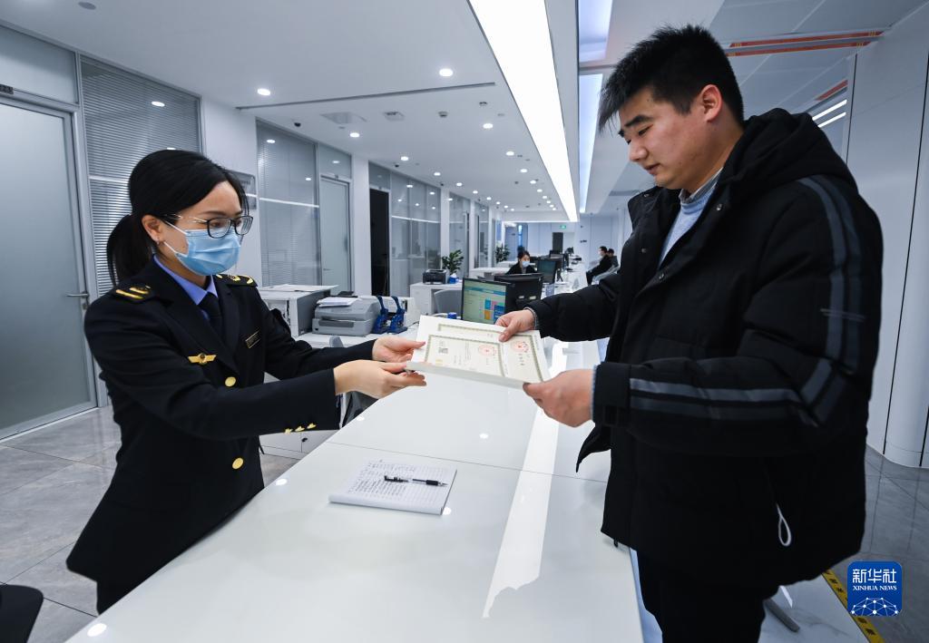 企業(yè)負責人在浙江省湖州市吳興區的中小微企業(yè)一站式服務(wù)平臺領(lǐng)取營(yíng)業(yè)執照(2023年2月8日攝)。新華社記者 徐昱 攝