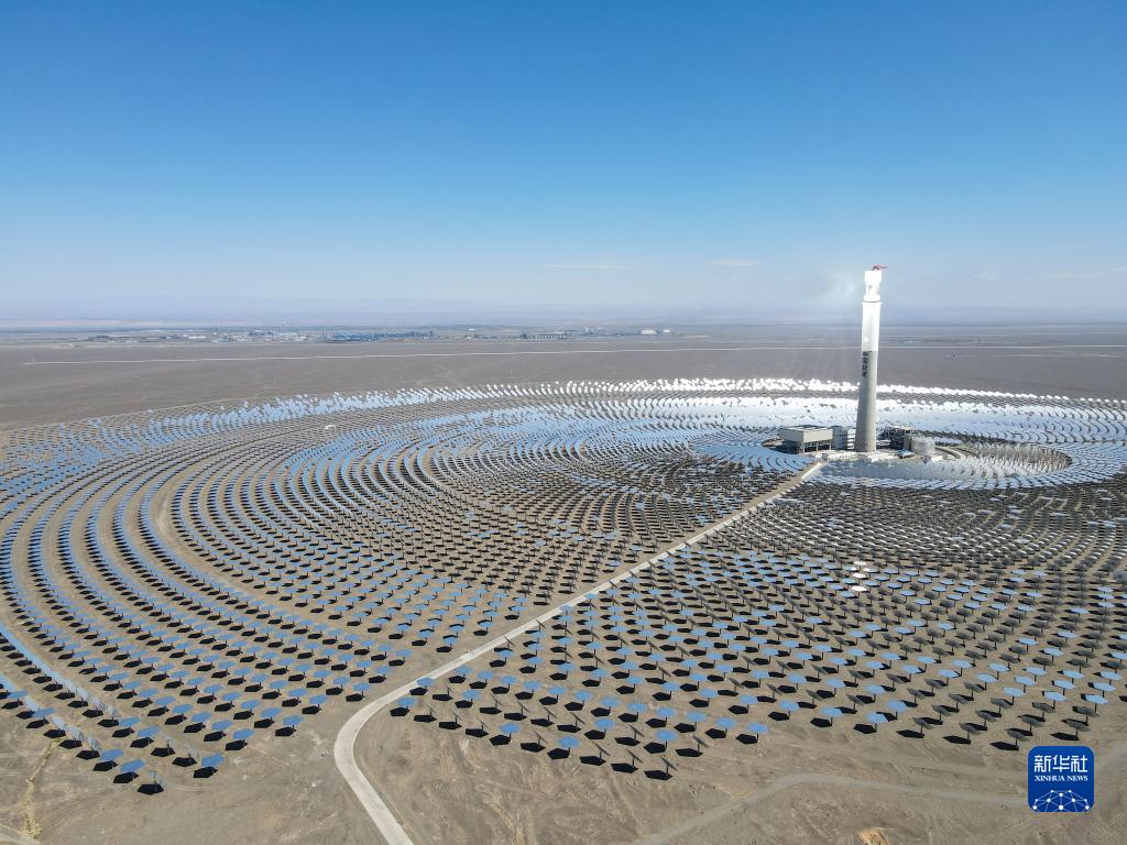 2021年8月22日拍攝的新疆伊吾縣淖毛湖鎮的哈密50兆瓦熔鹽塔式光熱發(fā)電站(無(wú)人機照片)。新華社記者 高晗 攝