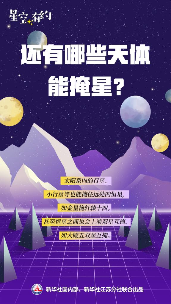 中科院紫金山天文臺科普部主管王科超介紹,月球在運行過(guò)程中,在視線(xiàn)方向上恰好遮擋住天體,就會(huì )形成“月掩星星”的現象,原理與日食類(lèi)似?!霸虑蛞曋睆胶艽?,且月球‘走’得很快,再加上在地球不同位置,所能看見(jiàn)的月球視差比較大,因此月球運行時(shí)‘掃過(guò)’的面積會(huì )比較大,‘月掩星星’的現象也比較容易產(chǎn)生?!?/p>