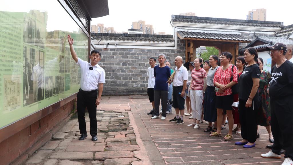 梅庭軍(左一)在遠東國際軍事法庭法官梅汝璈故居為村民和游客進(jìn)行講解。(梅志剛 攝)