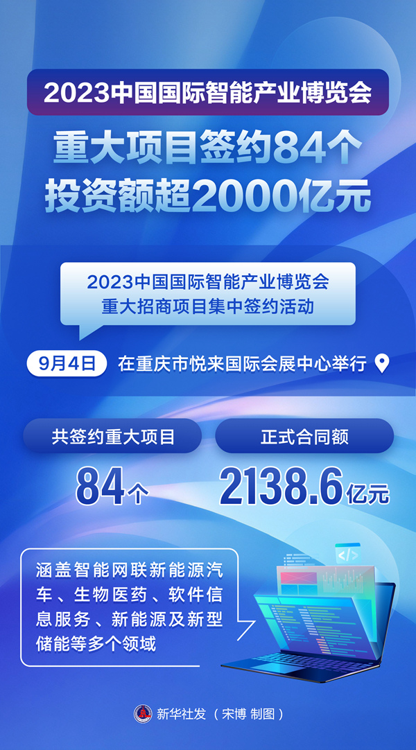 新華社重慶9月4日電(記者伍鯤鵬)2023中國國際智能產(chǎn)業(yè)博覽會(huì )重大招商項目集中簽約活動(dòng)4日在重慶市悅來(lái)國際會(huì )展中心舉行,共簽約重大項目84個(gè),正式合同額2138.6億元,涵蓋智能網(wǎng)聯(lián)新能源汽車(chē)、生物醫藥、軟件信息服務(wù)、新能源及新型儲能等多個(gè)領(lǐng)域。