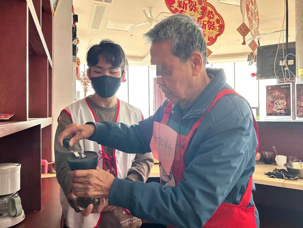2023年3月21日,認知癥老人在醫務(wù)社工的協(xié)助下制作咖啡。