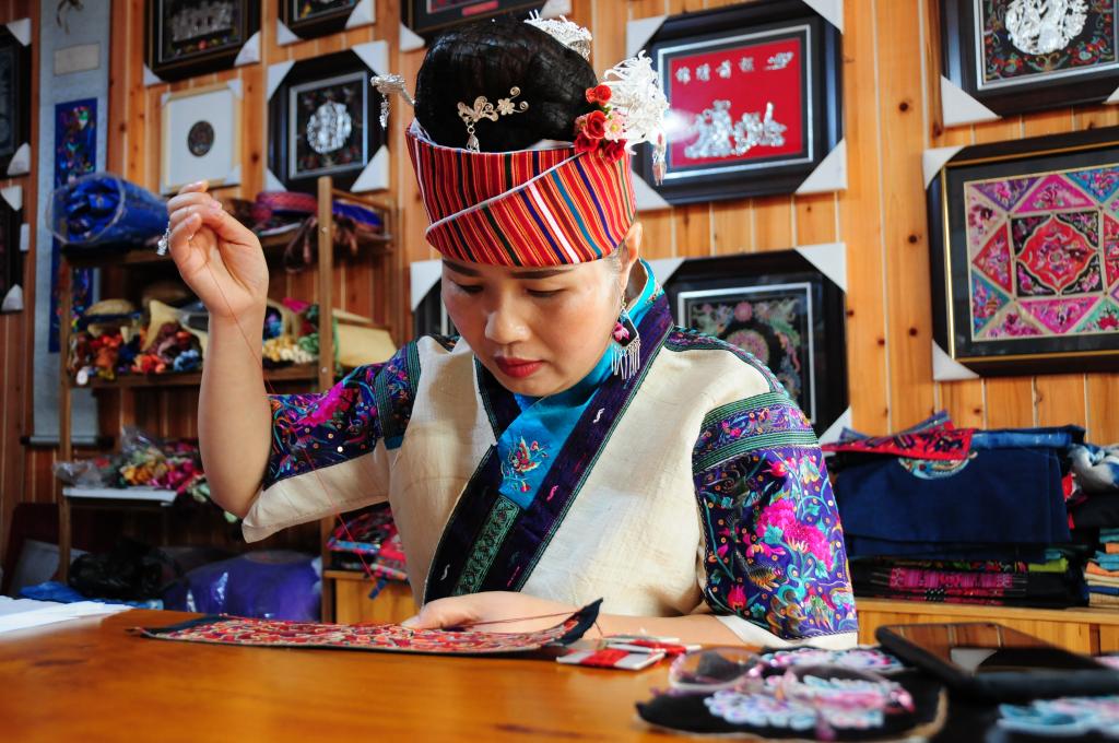 9月18日,貴州省臺江縣苗族繡娘石傳英在制作苗繡。新華社記者胡星攝