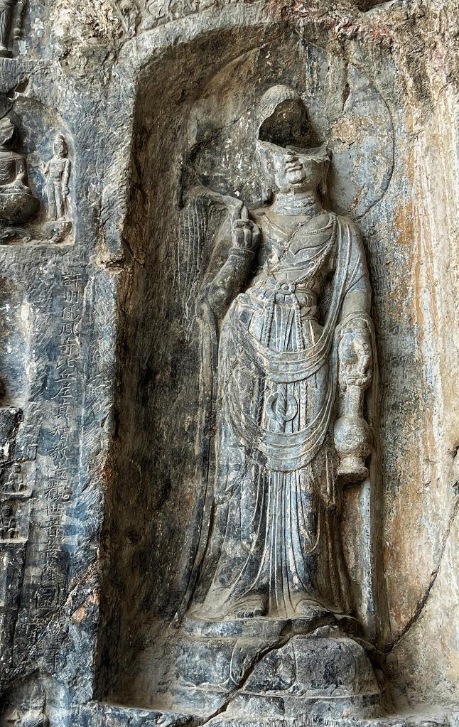 龍門(mén)石窟萬(wàn)佛洞前庭南壁一圓拱龕內的觀(guān)世音菩薩立像。新華社記者 唐健輝 攝