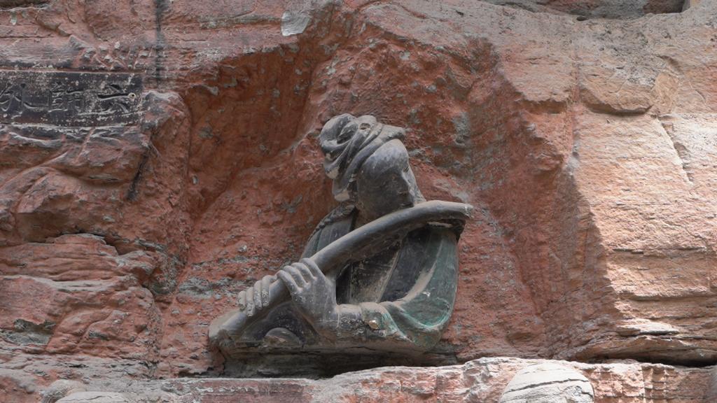 想了解大足石刻的世俗化特征,就不得不提到寶頂山的牧牛圖造像。這龕造像取材于古人山中牧牛的現實(shí),順著(zhù)山巖的自然彎曲,刻畫(huà)出牧牛人揮鞭趕牛、暢然酣睡,牛兒翹尾狂奔、自舔其蹄等生動(dòng)逼真的形象,其別致的民間情調把游客帶入詩(shī)情畫(huà)意的民間生活中。