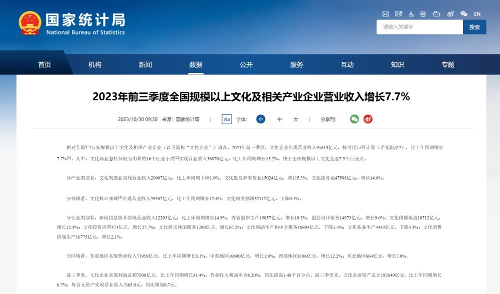 據對全國7.2萬(wàn)家規模以上文化及相關(guān)產(chǎn)業(yè)企業(yè)(以下簡(jiǎn)稱(chēng)“文化企業(yè)”)調查,2023年前三季度,文化企業(yè)實(shí)現營(yíng)業(yè)收入91619億元,按可比口徑計算(詳見(jiàn)附注2),比上年同期增長(cháng)7.7%[1]。其中,文化新業(yè)態(tài)特征較為明顯的16個(gè)行業(yè)小類(lèi)[2]實(shí)現營(yíng)業(yè)收入36870億元,比上年同期增長(cháng)15.2%,快于全部規模以上文化企業(yè)7.5個(gè)百分點(diǎn)。