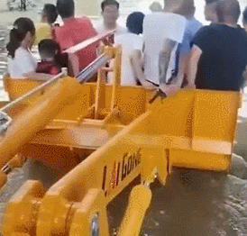 在湖北襄陽(yáng),路面積水,行人車(chē)輛無(wú)法前行,一男子見(jiàn)狀開(kāi)來(lái)鏟車(chē),載著(zhù)上班的市民送至路對面,解決了大家的燃眉之急。