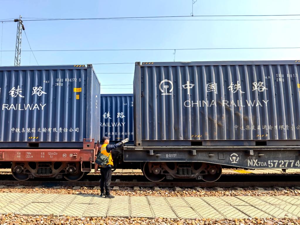 昆明東站工作人員對即將出發(fā)的中老鐵路國際貨物列車(chē)進(jìn)行裝載加固檢查。(新華社記者丁怡全攝)