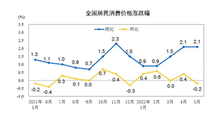 “5月份,國內疫情防控形勢持續向好,消費市場(chǎng)供應總體充足,CPI環(huán)比由上月上漲0.4%轉為下降0.2%,同比漲幅保持穩定?!眹医y計局城市司高級統計師董莉娟說(shuō)。