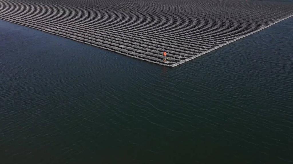 項目占湖面面積300畝,總裝機容量為17.94兆瓦。該水域是煤礦排放的高鹽尾水,腐蝕性離子濃度高。光伏大型漂浮方陣的浮體材料和結構均選擇高強度、高耐腐蝕的材料,可以有效抵御侵蝕。