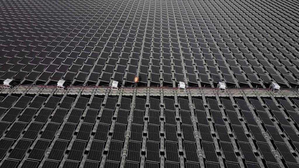 國家能源集團寧夏電力寧東電廠(chǎng)3×5.98兆瓦漂浮分布式光伏發(fā)電項目位于寧夏靈武市馬家灘鎮毛烏素沙地邊緣,這里氣候干旱少雨,煤炭資源豐富,煤炭開(kāi)采中排出的礦井水形成了大大小小的湖泊。