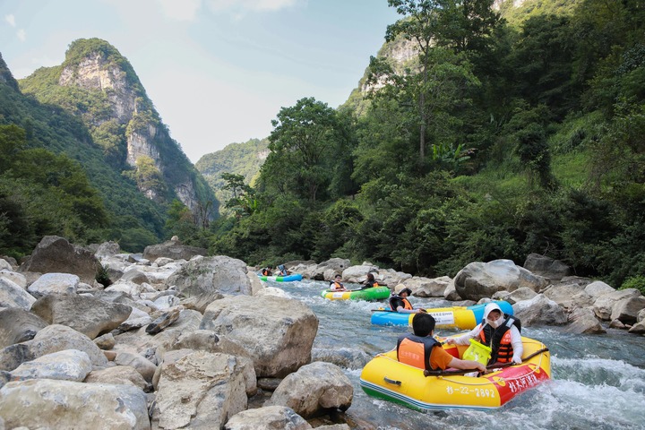 8月4日,游客在貴州省施秉縣杉木河景區漂流。新華社記者 劉續 攝