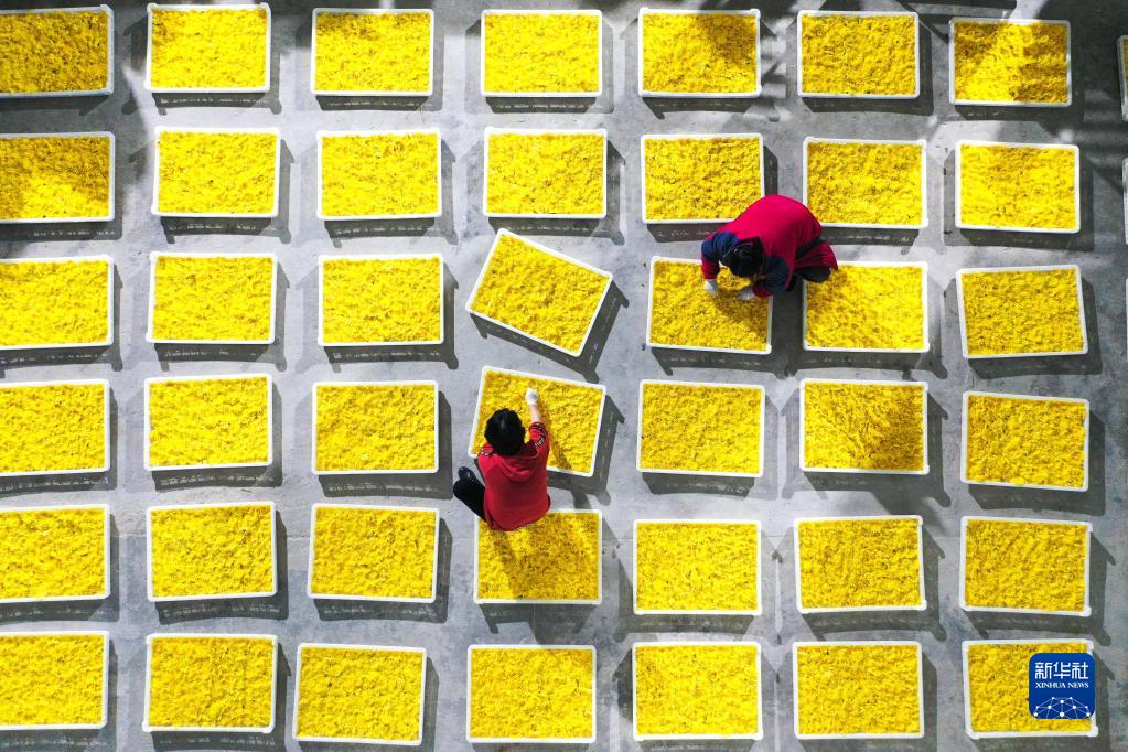 村民在貴州省貴定縣云霧鎮一菊花加工車(chē)間攤晾金絲皇菊(2022年10月20日攝,無(wú)人機照片)。新華社記者 楊文斌 攝