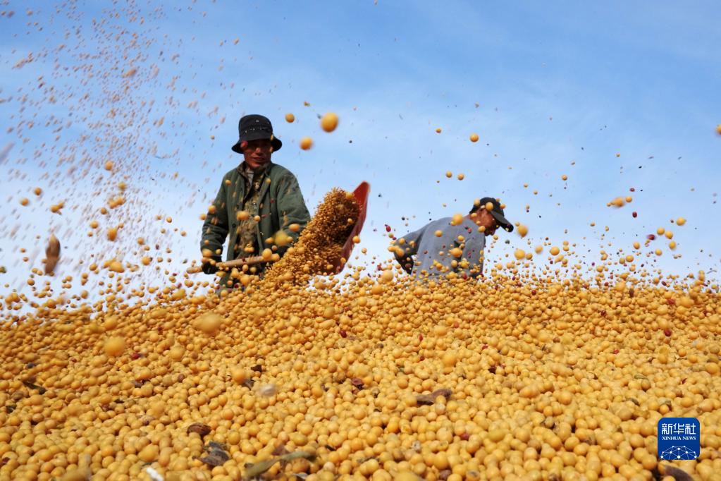 在北大荒農墾集團有限公司北安分公司趙光農場(chǎng)有限公司,工作人員在一處曬場(chǎng)的大豆堆上忙碌(2022年10月20日攝)。新華社記者 王建威 攝