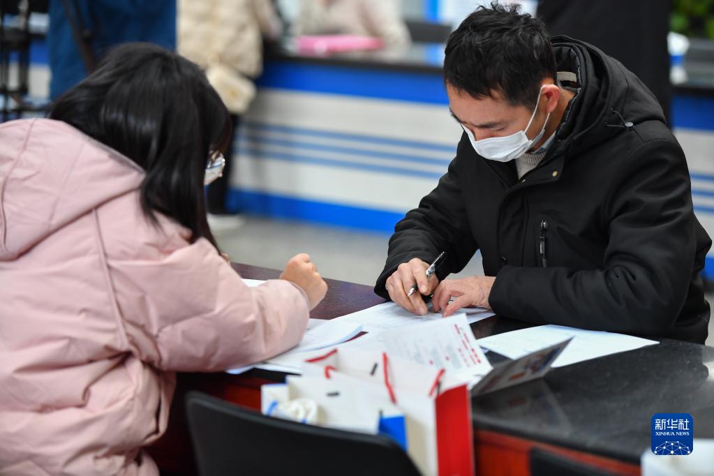 1月28日,在湖南省長(cháng)沙市人力資源市場(chǎng),求職者(右)在填寫(xiě)應聘信息表。新華社記者 陳澤國 攝