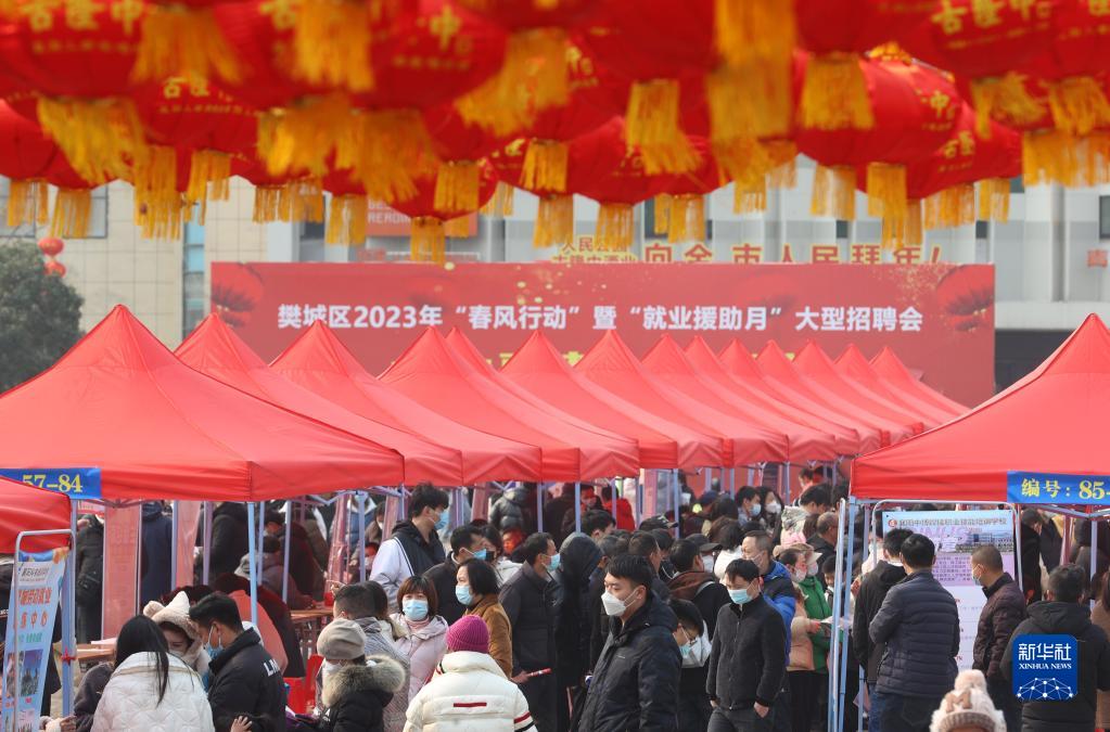 2月1日,求職者在湖北襄陽(yáng)人民廣場(chǎng)舉行的招聘會(huì )上了解崗位情況。新華社發(fā)(王虎 攝)