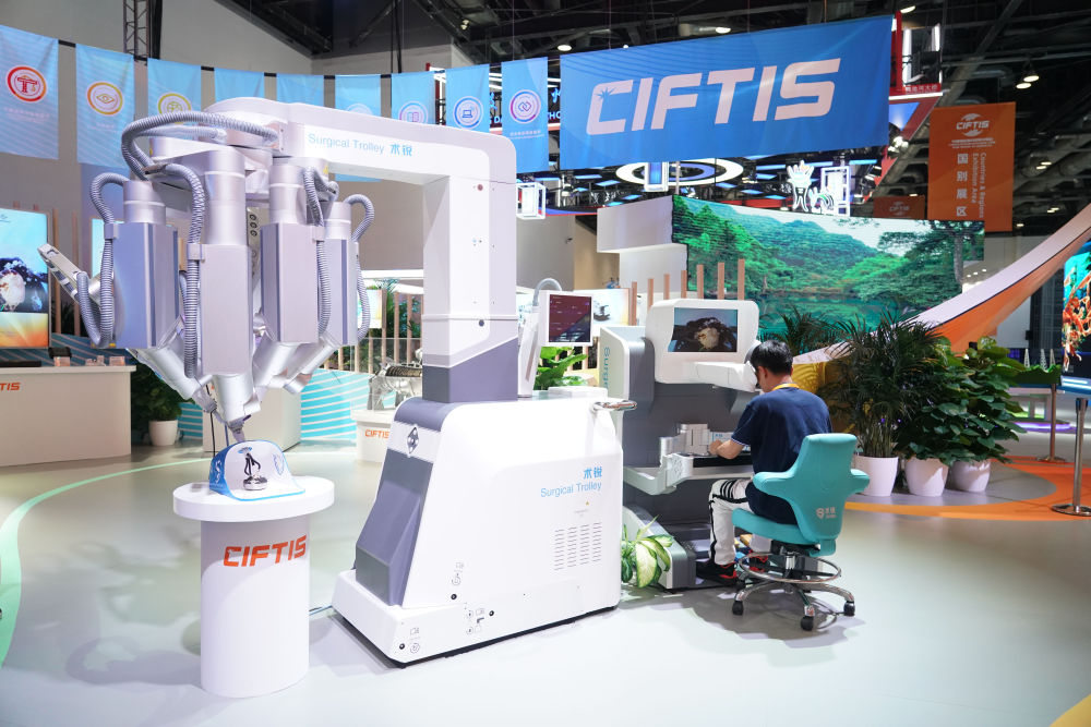 這是9月1日在國家會(huì )議中心拍攝的一款單孔腔鏡手術(shù)機器人。新華社記者 任超 攝