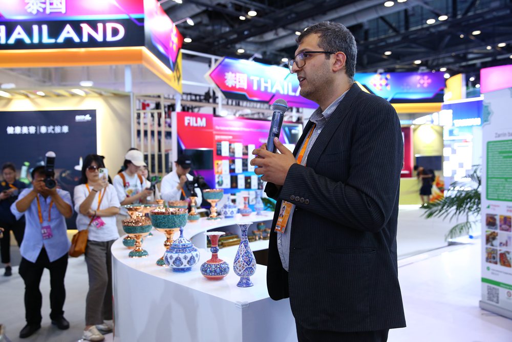 9月1日,參展商在國家會(huì )議中心向媒體記者介紹展臺信息。新華社記者 孫瑋彤 攝