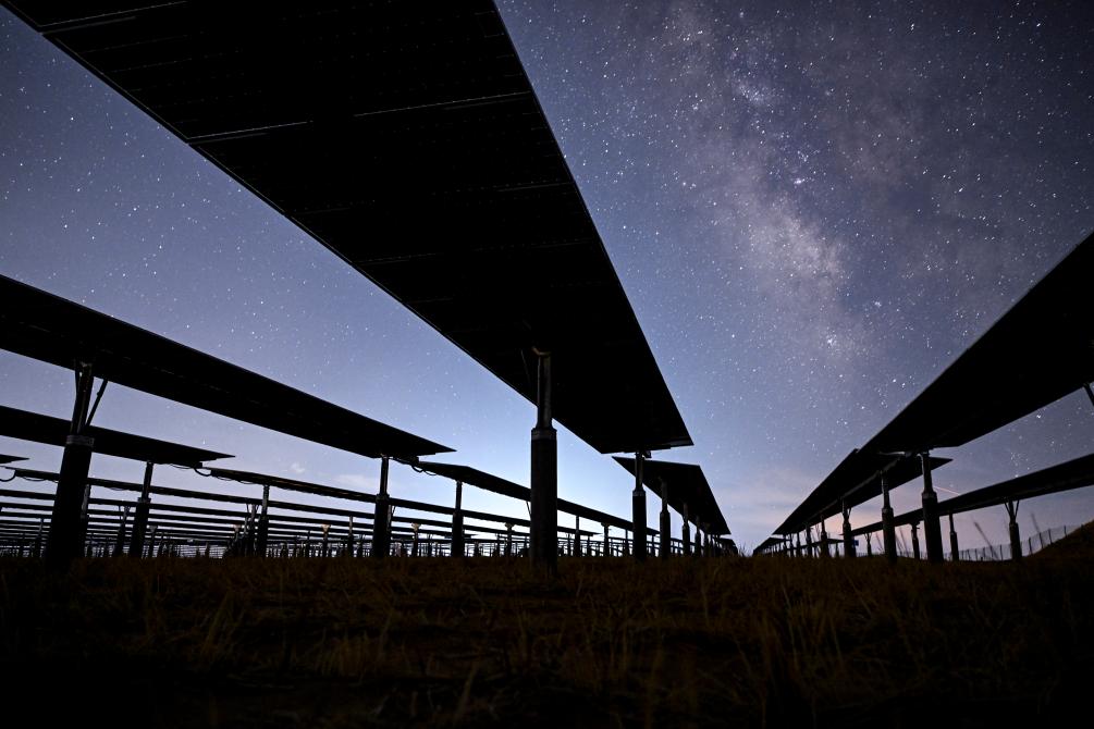↑ 銀河下的寧夏騰格里沙漠新能源基地(8月9日攝)。