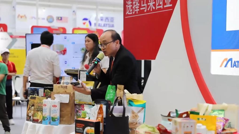 走進(jìn)馬來(lái)西亞館,一場(chǎng)產(chǎn)品推介會(huì )正在進(jìn)行中。馬來(lái)西亞參展商姚建祥正在臺上熱情推介一款椰子水。