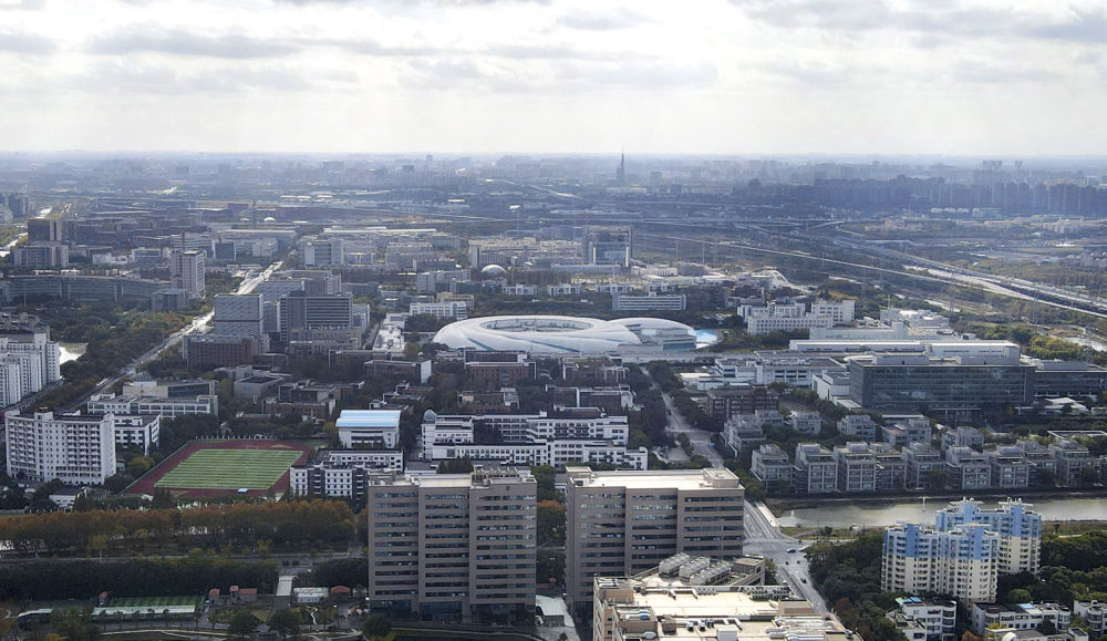 這是2023年11月25日在上海浦東新區張江科學(xué)城拍攝的形如鸚鵡螺的大科學(xué)裝置上海光源(中)(無(wú)人機照片)。新華社記者 方喆 攝