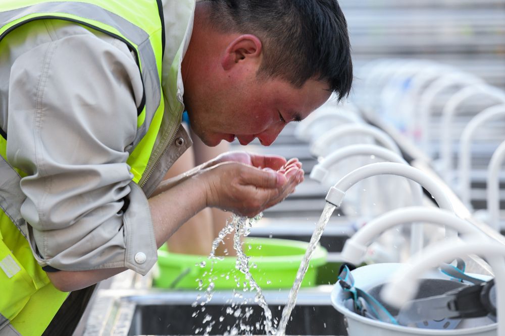 3月9日,臨時(shí)用水接通。這是一名建設者用涼水給曬紅的臉降溫。