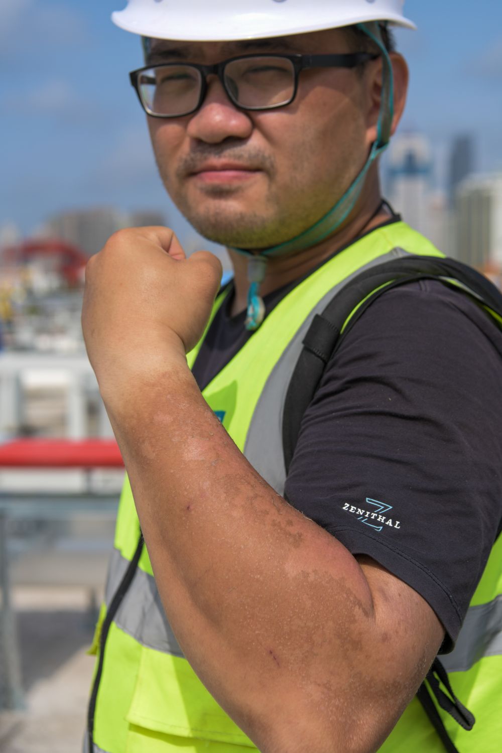 3月17日,一名建設者展示被暴曬脫皮的胳膊。