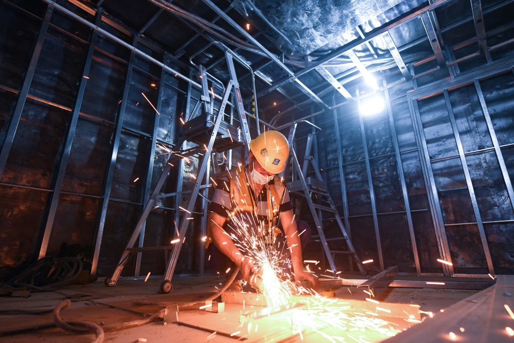3月27日,工人在建設中的應急醫院CT室里作業(yè)。